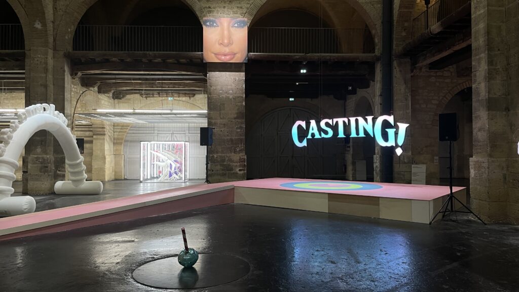 Il est difficile de citer telle ou telle oeuvre en particulier tant l’expo se visite comme un tout, un grand décor. Mais parmi les travaux marquants, on peut citer le manège dysfonctionnel de Bertille Bak, qui va soit trop vite, soit trop lentement ; les montagnes russes de Jesse Darling qui semblent neutralisées par la gravité ; les chupa chups de Thomas Liu le Lann éclatées au sol (ce n’est pas une expression, elles sont vraiment retournées sur le sol) et le lutin enfermé dans une machine à peluches, du même artiste. Au fond, une scène semble attendre des participants, comme le mentionne l’immense enseigne « Casting ! » qui surplombe cette estrade, sous le regard d’une Kim Kardashian enfermée dans un cadre trop petit. Mais là encore, personne. On nous ramène aussi bien au XIXe siècle et à ses monstres de foire qu’au futur, avec des créatures hybrides pas vraiment identifiables.
